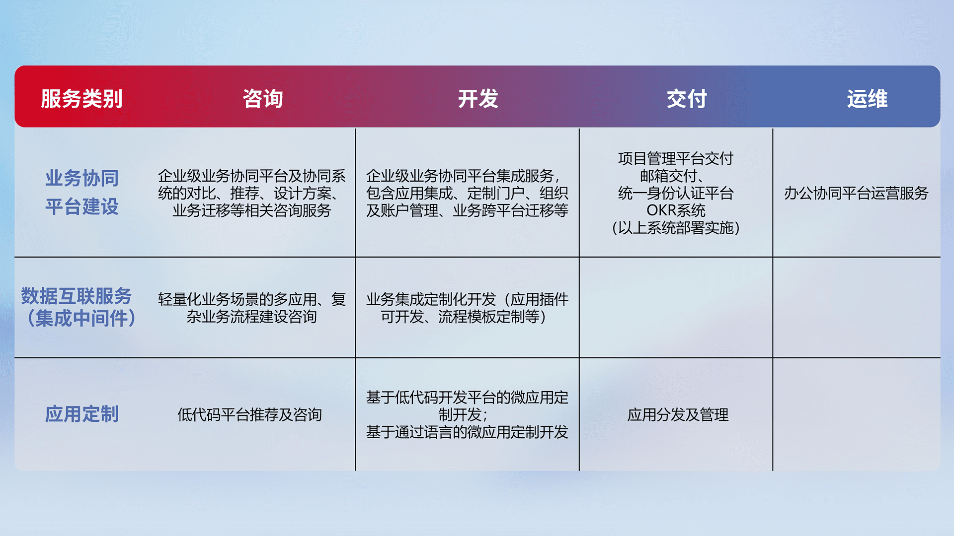 针对钉钉、、、企微、、、IDaas等平台级产品提供产品的规划、、、方案、、交付、、、、定制化开发等服务,,实现如统一协同办公、、、、智能客户服务、、、混合会议管理、、、智能数据查询、、、、等业务场景,,实现数字化转型。。。。