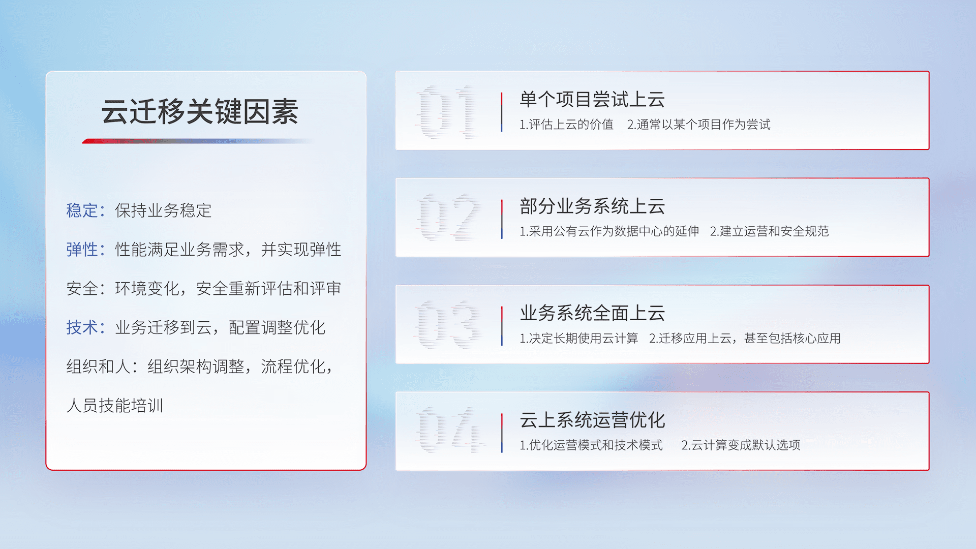 结合实际业务,,,从规划设计、、云平台选型、、、云原生改造、、、数据迁移、、集成交付,,,,迁移全过程为客户识别最佳上云路径,,做好风险识别管理,,,,设计网络架构、、、身份权限、、、、安全审计合规、、操作审计、、、日志审计、、、监控告警策略、、多站点容灾设计等,,,对云上基础设施进行整体规划,,,提升IT治理水平,,,以满足弹性、、、、高可用、、高性能的需求。。。。
