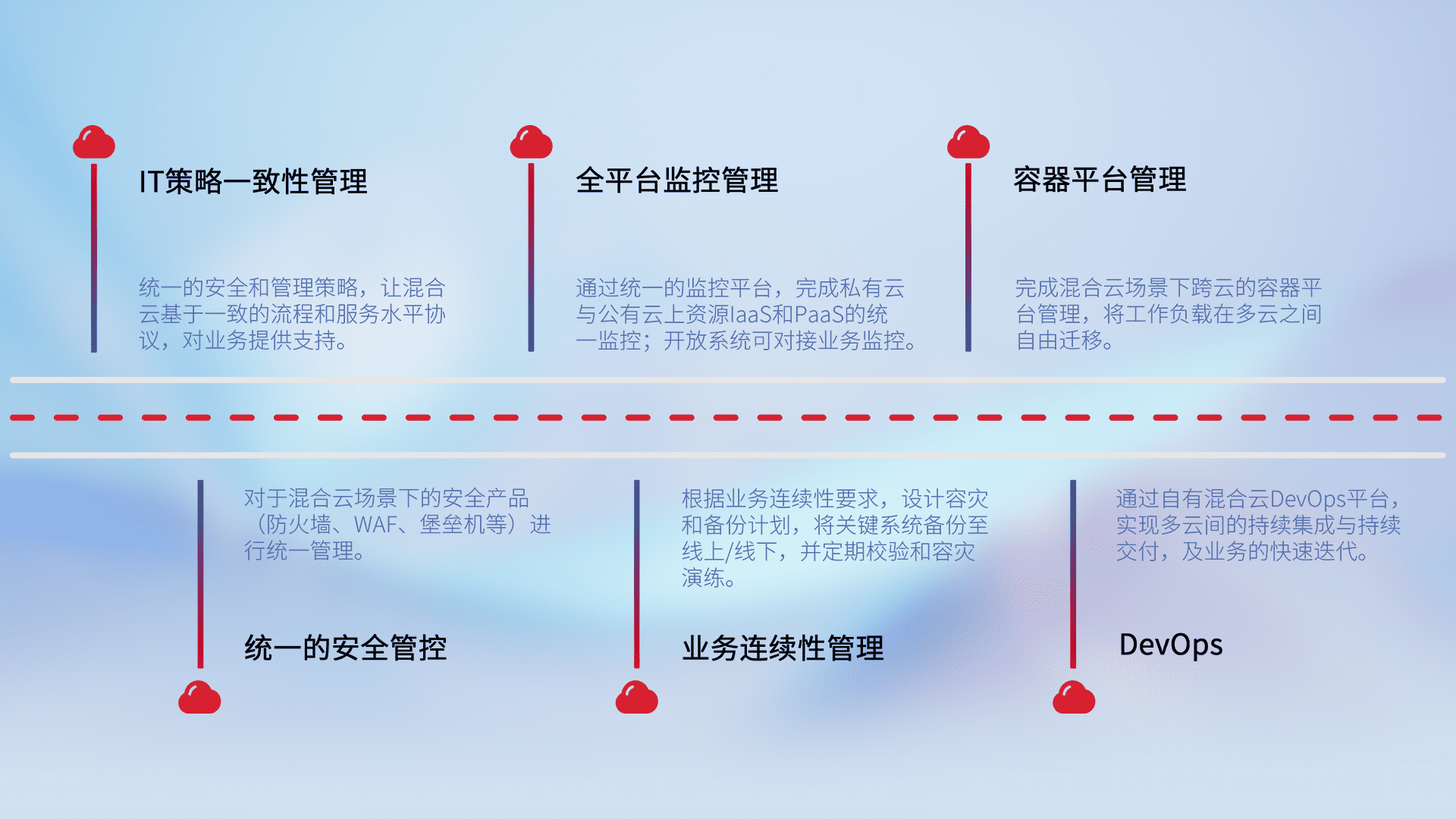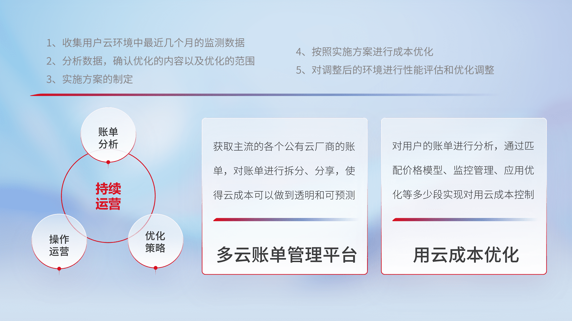 通过多云纳管,,,以统一的资源数据模型把客户的云资源进行抽象和封装,,进而实现对多云资源的统一操作,,,,保障云资源管理的可靠性、、稳定性与可用性。。量身定制化运维内容,,配置、、、开发运维、、、、补丁管理、、备份、、、监控、、、认证和访问管理、、、、审计和日常巡检等,,,,保障在用云过程中的可靠度,,,,稳定度以及高可用率。。