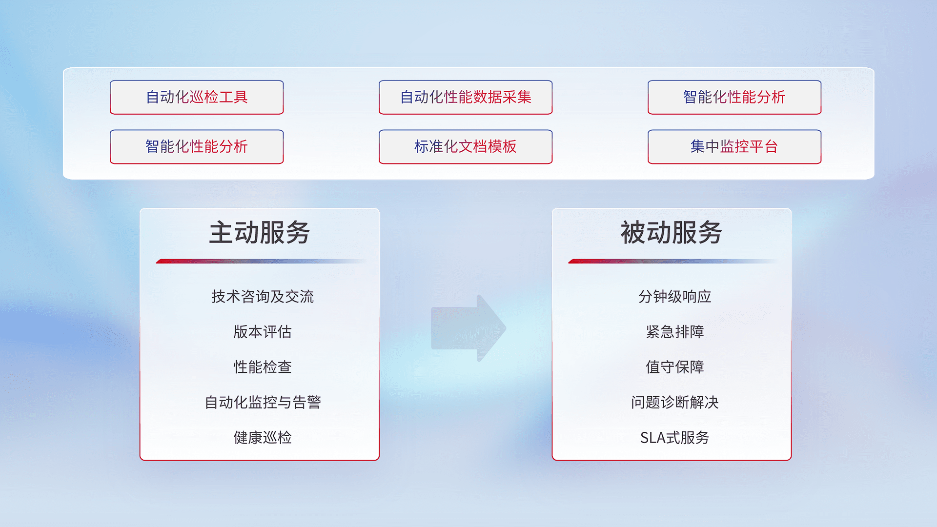智能化工具和标准化文档,,,保障服务质量,,提供主动服务(包含技术咨询、、、版本评估、、、、性能检查、、自动化监控与告警、、、、健康巡检)和被动服务包含(分钟级响应、、、紧急排障、、值守保障、、问题诊断解决、、SLA服务)。。。